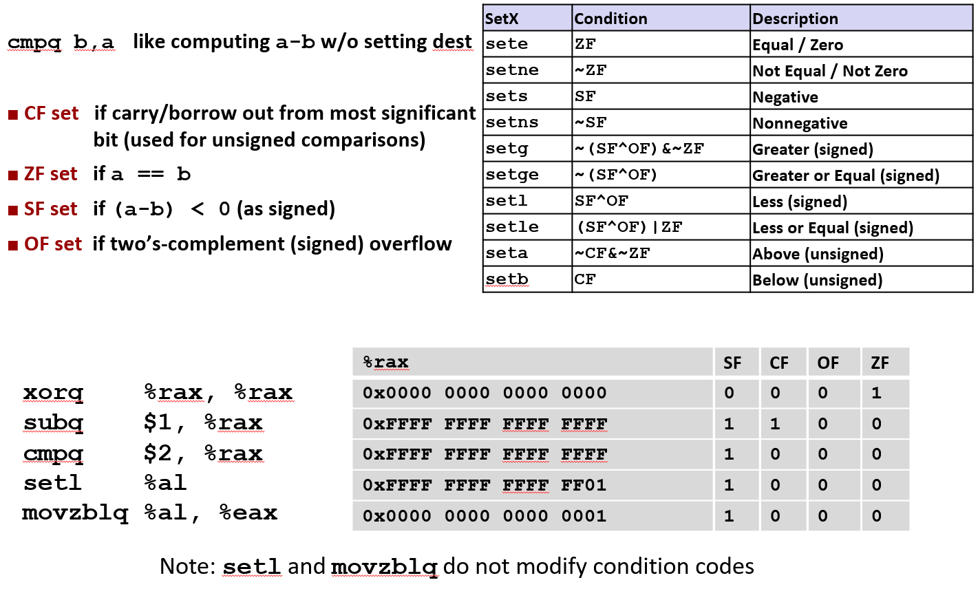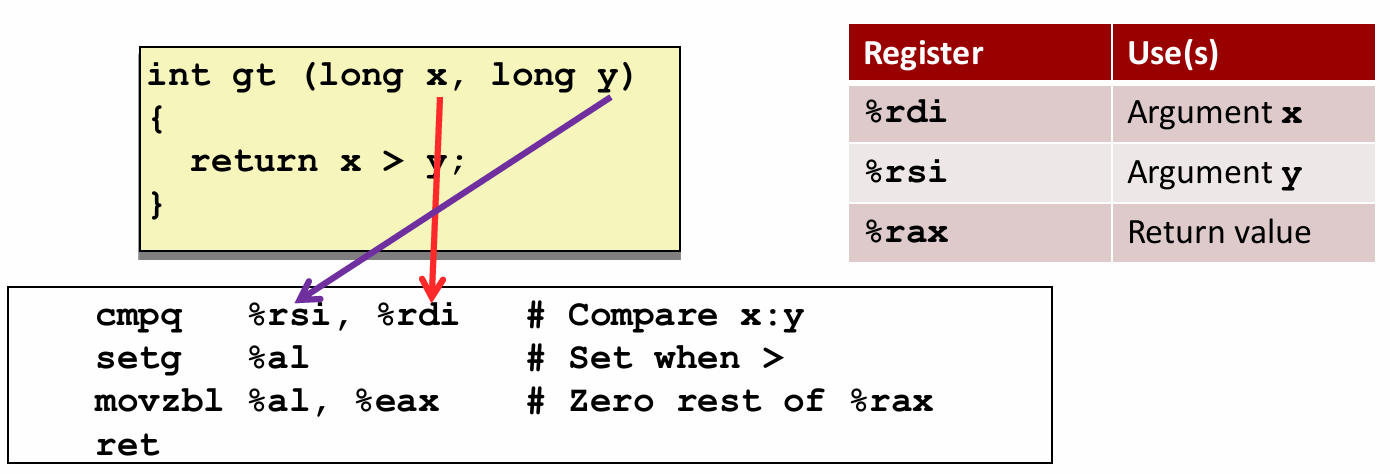 setg根据标志位判断x > y,结果存到%al(0 或 1); - 用