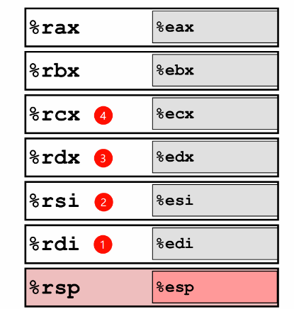 - x86-64架构前6个参数寄存器顺序为rdi、rsi、rdx、rcx、r8、r9,超过6个的参数从右向左入栈