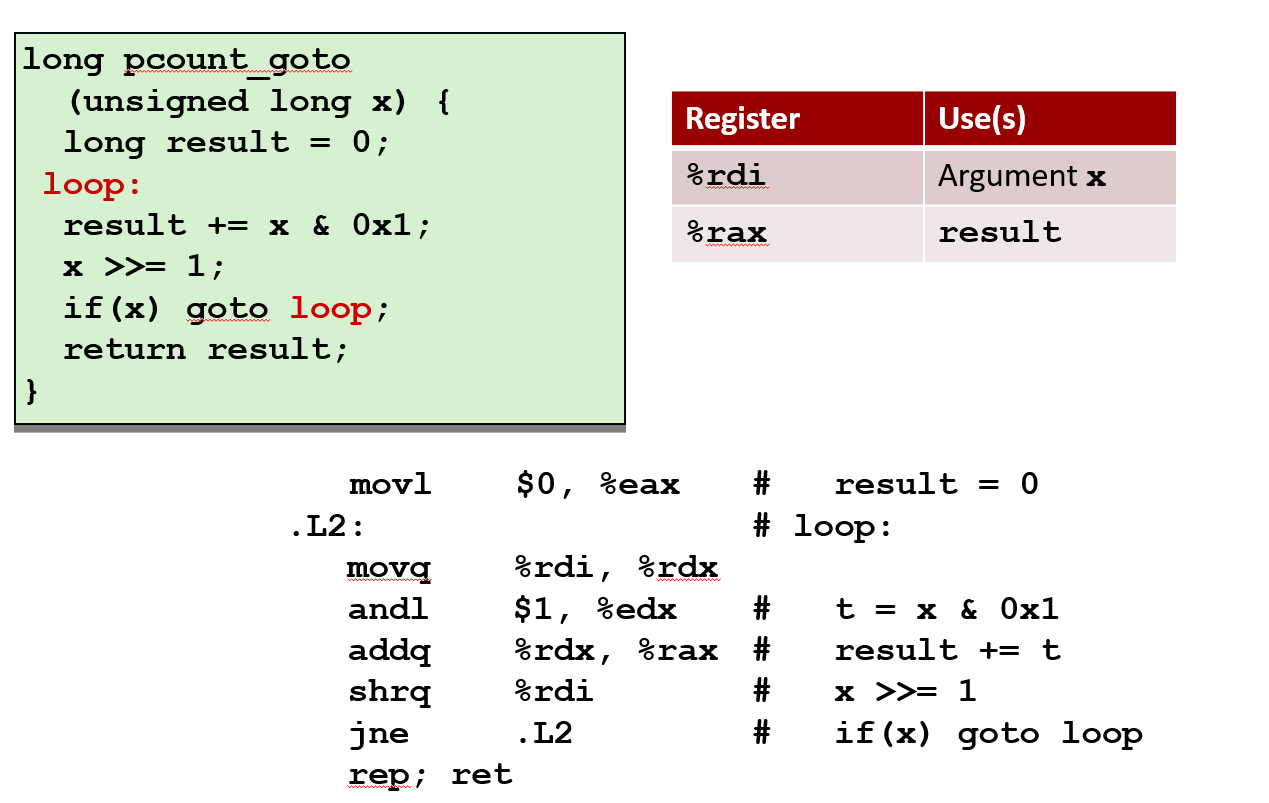 若 %rdi(x)不为0(x != 0),则跳回 .L2(循环体入口)。 |