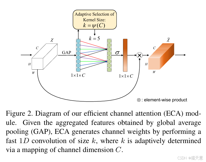 ECA-Net认为通道间依赖具有局部性,无需全局交互。其通过指数映射函数自适应确定一维卷积核大小(k=ψ©,C为通道数),通道数越多卷积核越大,适配不同网络层的通道规模,灵活捕获局部通道依赖,且映射无需额外学习参数。 - 轻量化设计,实现高效计算