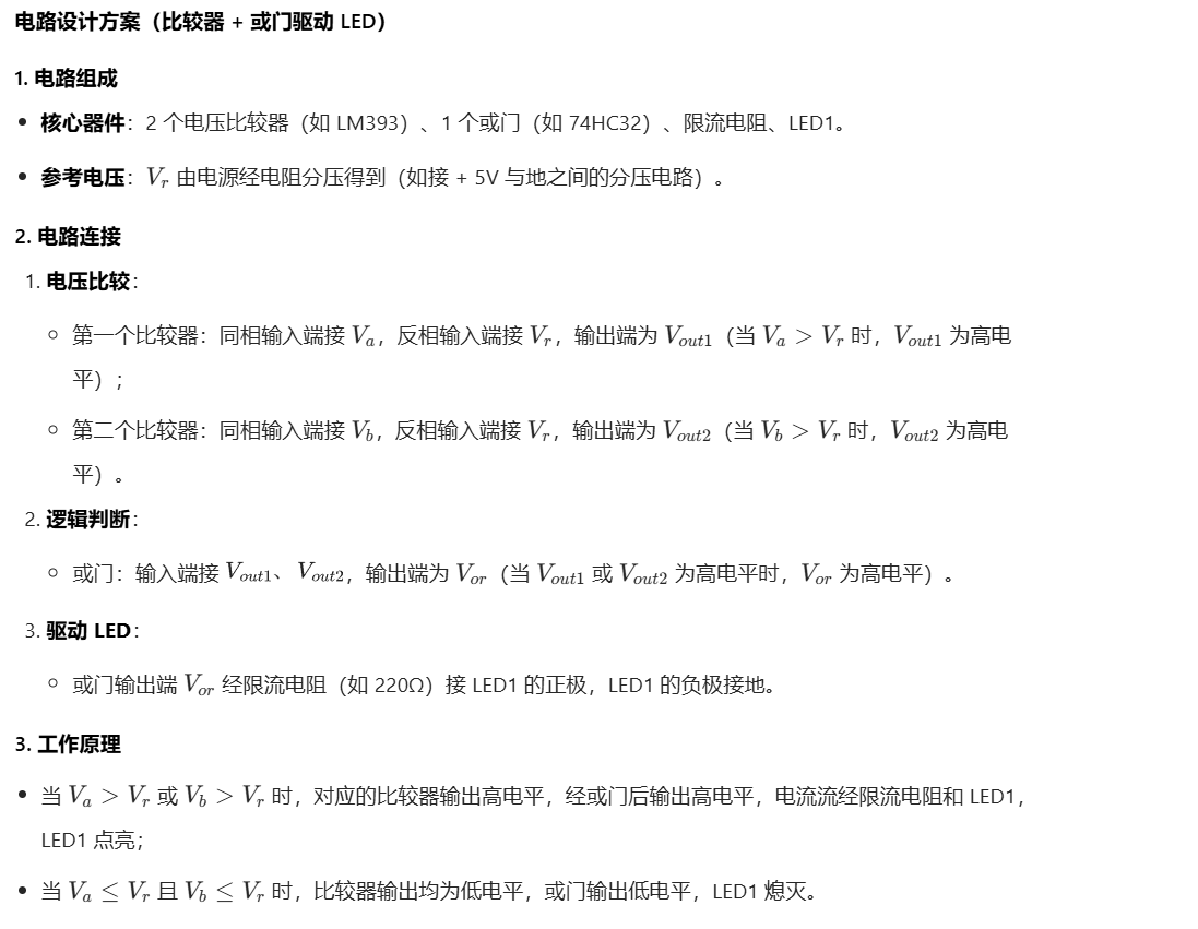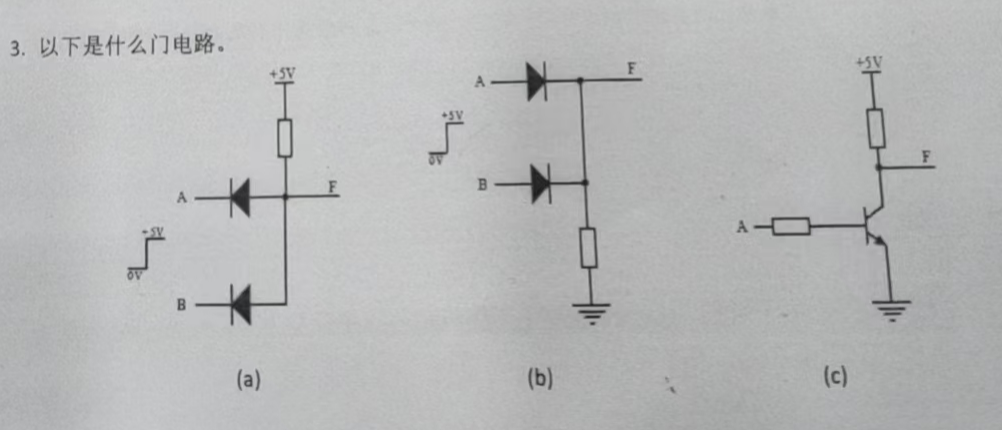- 原理:采用二极管并联结构,当输入 A、B 中任意一个为高电平(+5V)时,对应的二极管导通,输出 F 被钳位在高电平;仅当 A、B 均为低电平时,二极管截止,输出 F 为低电平。