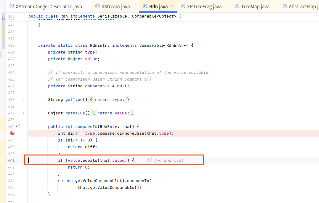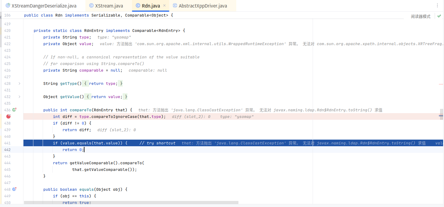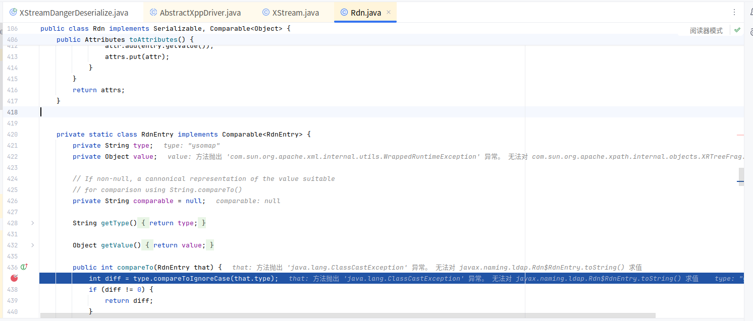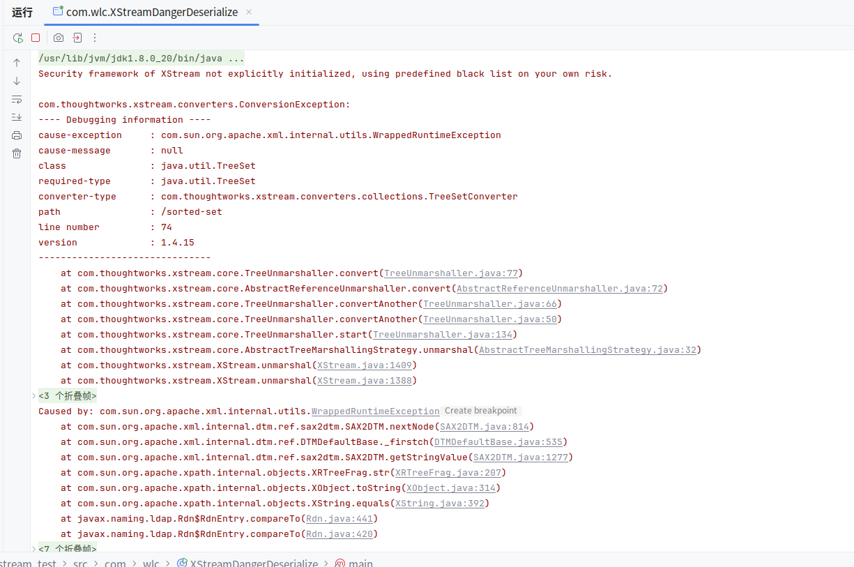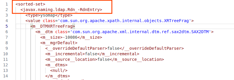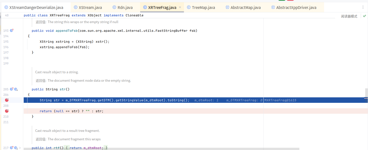 因此可以总结一下。有一个xml需转换成java对象,因为这个xml中包含了<sorted-set>这样的节点,因此xstream会尝试将其转换为TreeSet,因为TreeSet是有序集合,在往TreeSet里面add元素的时候,会调用元素的compareTo方法进行一个排序。而因为RdnEntry类被作为里TreeSet中的元素,会调用RdnEntry.compareTo()方法对RdnEntry进行排序,而xml中<RdnEntry>节点中又包含了<XRTreeFrag>节点,而<XRTreeFrag>节点里又包含了<m__DTMXRTreeFrag>节点,