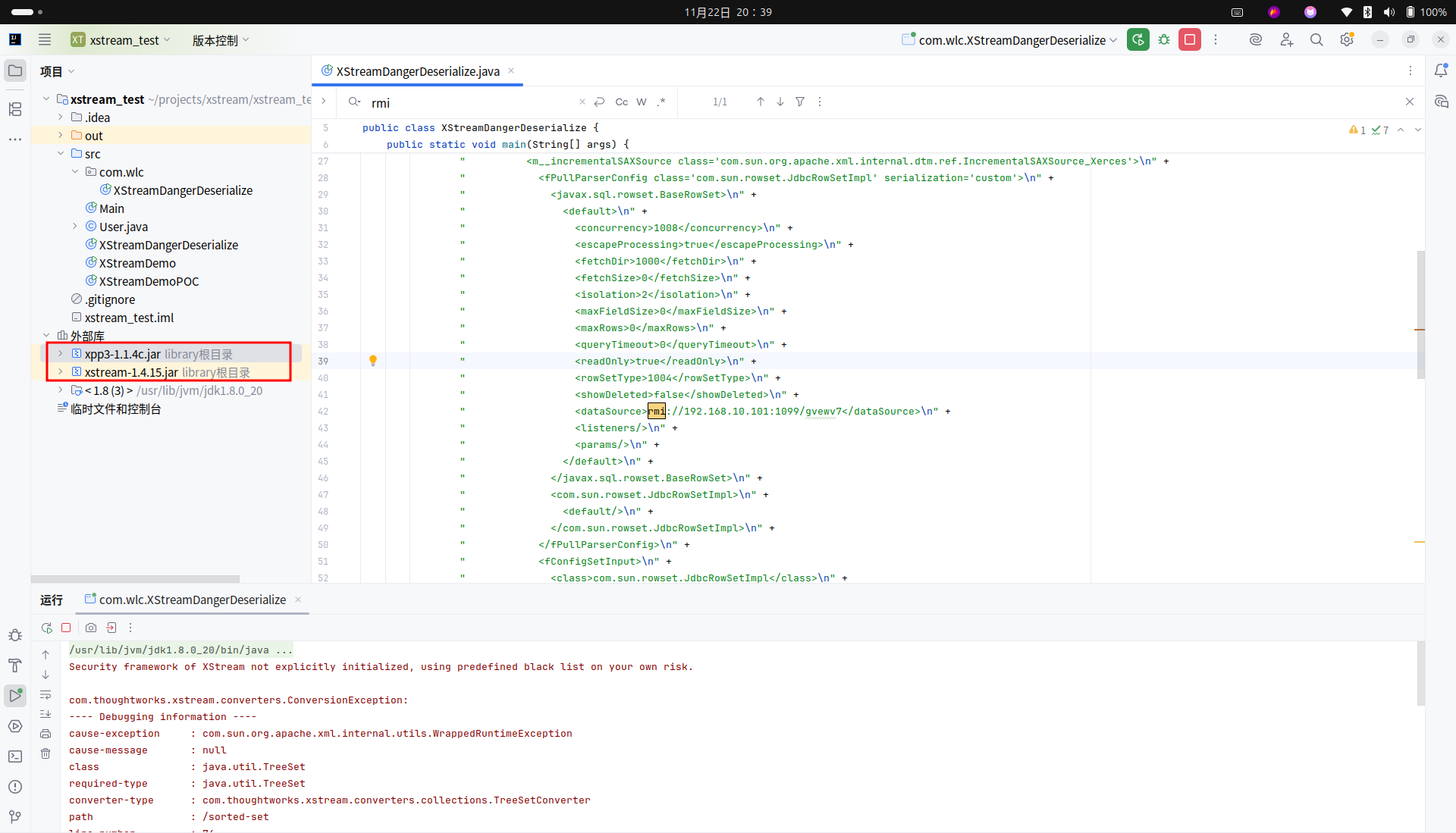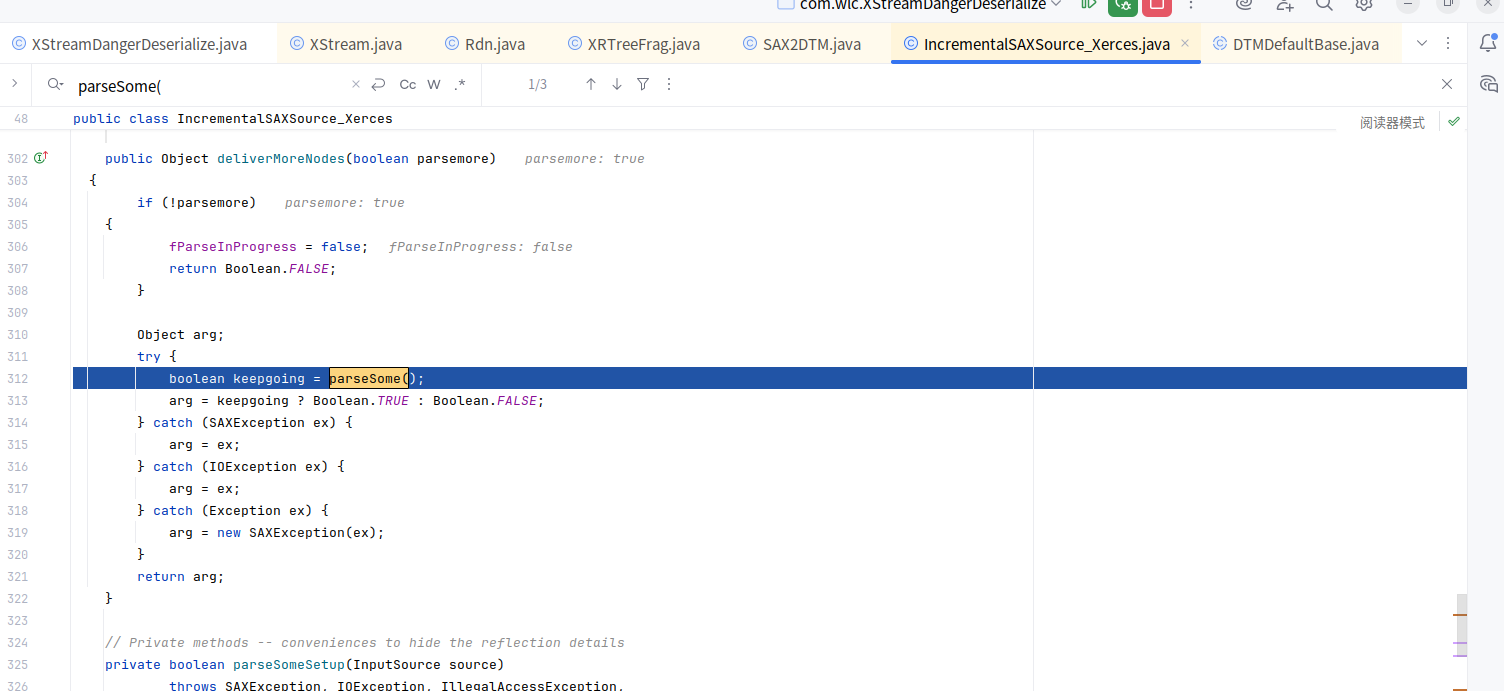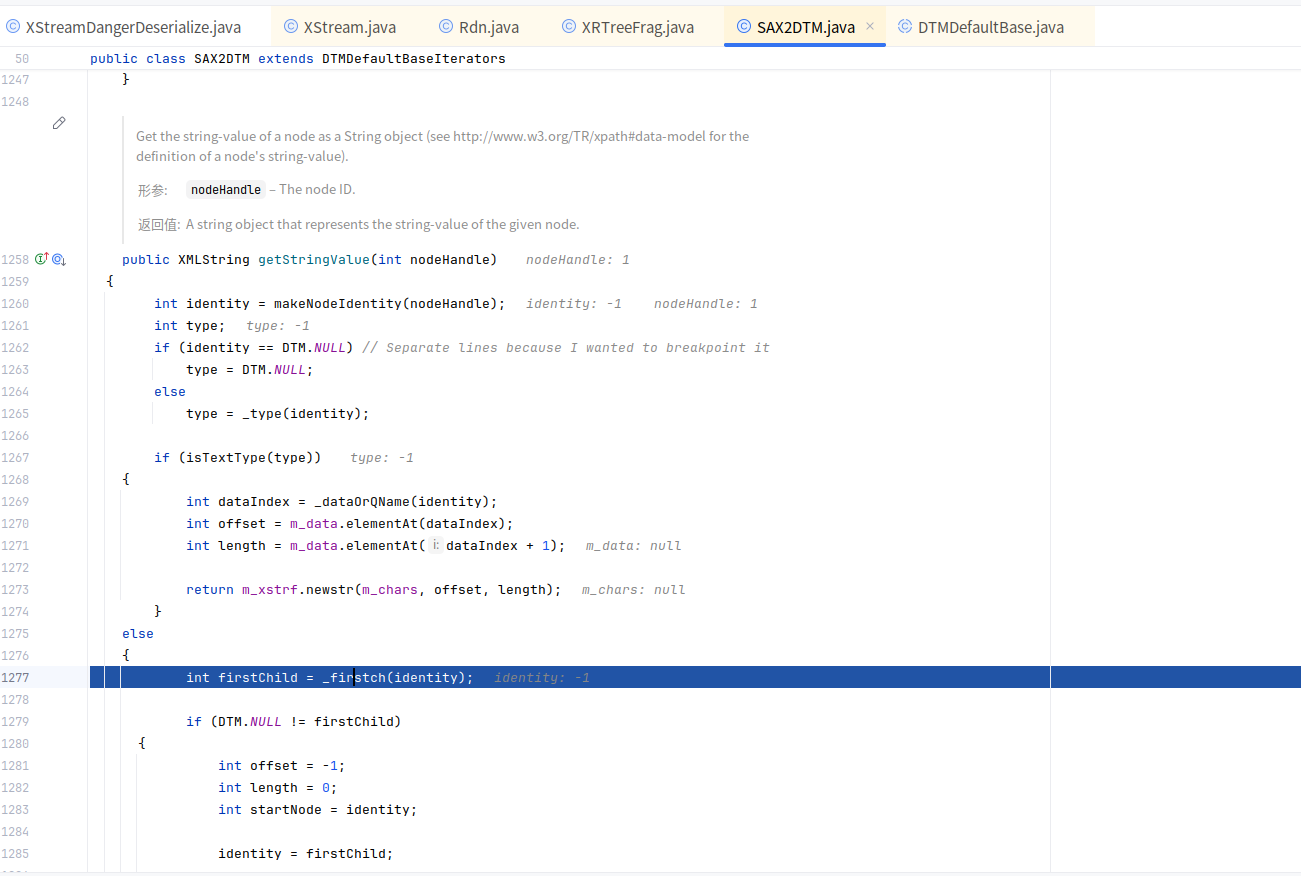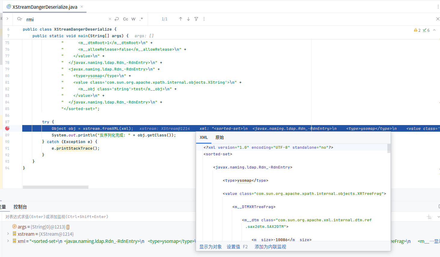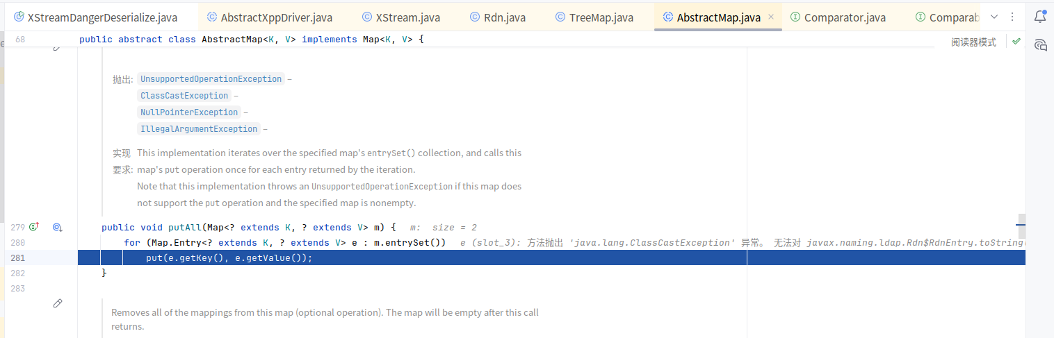 因此可以总结一下。有一个xml需转换成java对象,因为这个xml中包含了<sorted-set>这样的节点,因此xstream会尝试将其转换为TreeSet,因为TreeSet是有序集合,在往TreeSet里面add元素的时候,会调用元素的compareTo方法进行一个排序。而因为RdnEntry类被作为里TreeSet中的元素,会调用RdnEntry.compareTo()方法对RdnEntry进行排序,而xml中<RdnEntry>节点中又包含了<XRTreeFrag>节点,而<XRTreeFrag>节点里又包含了<m__DTMXRTreeFrag>节点,