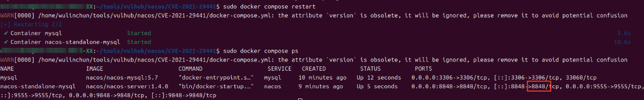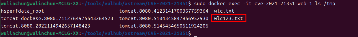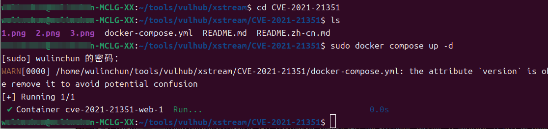 **Step1、**进入CVE-2021-21351目录,执行命令sudo docker compose up -d启动漏洞镜像环境。