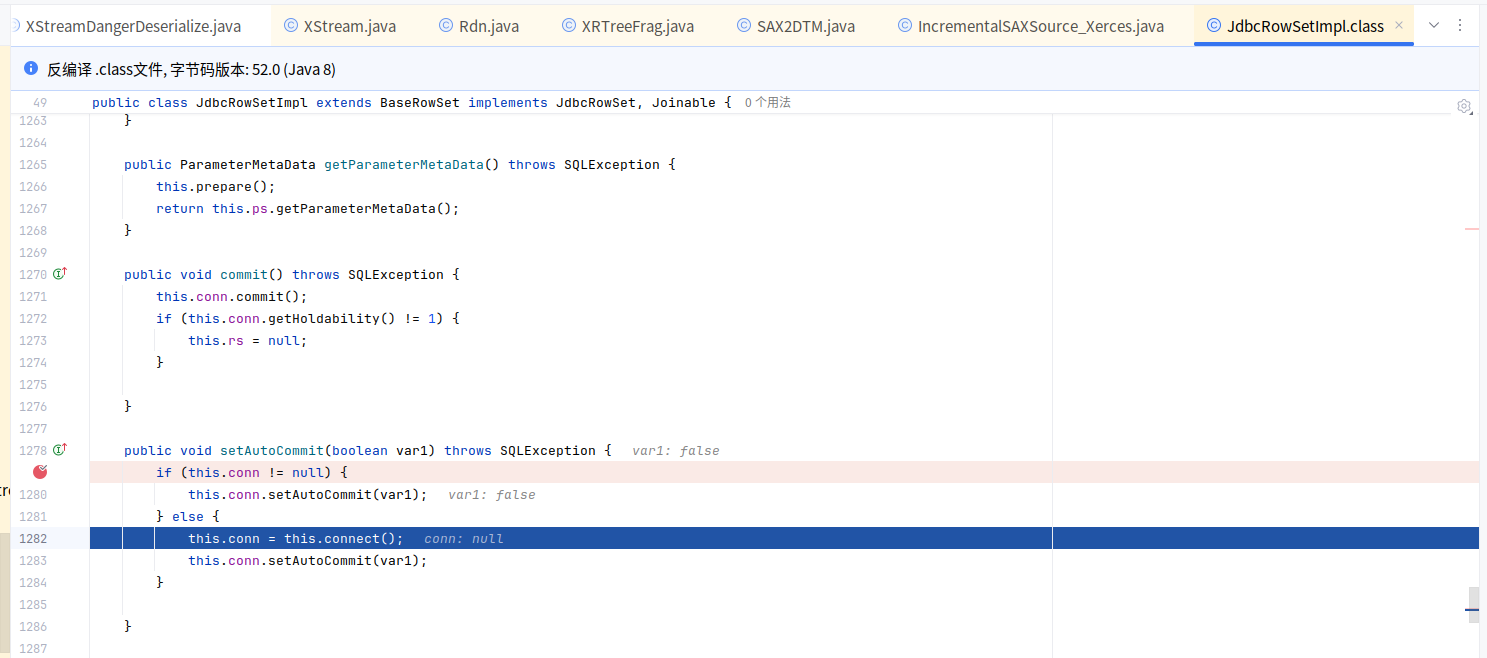 JdbcRowSetImpl.setAutoCommit()这个方法的作用是设置 RowSet 对象内部使用的数据库连接是否开启自动提交。