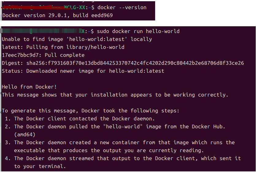 # 3. 运行测试镜像(输出 Hello from Docker! 则功能正常)