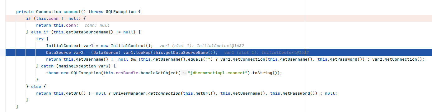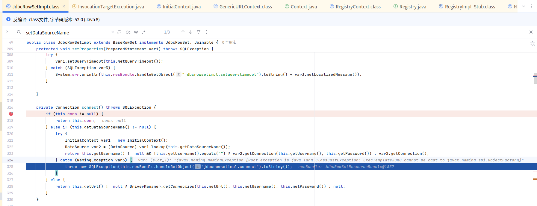 在Context.lookup(rmi地址)调用结束后,会触发一个SQLException的报错,之所以会报错,是因为InitialContext.lookup(rmi地址)返回值不是DataSource类型。而是返回Reference类型,类型不匹配因此catch了错误异常。