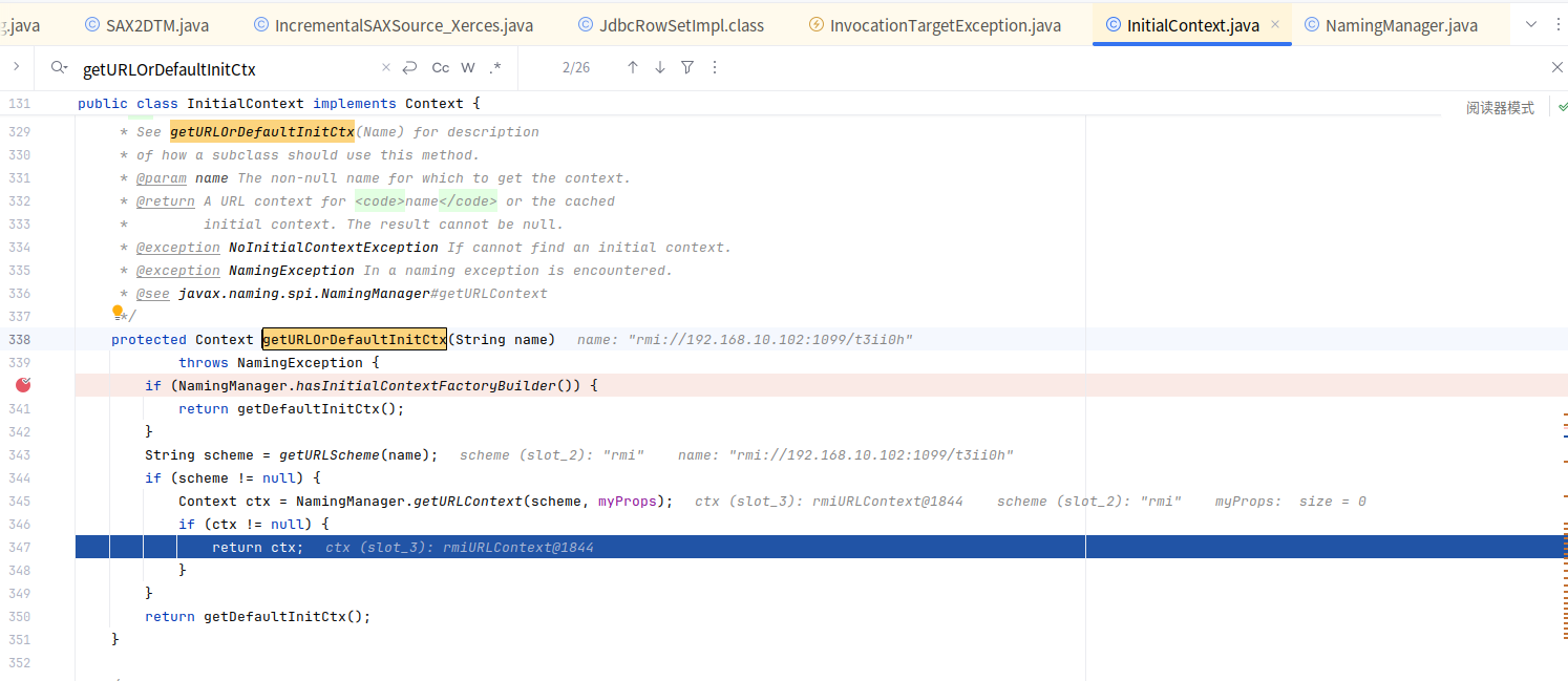 InitialContext.getURLOrDefaultInitCtx() 的作用是识别 JNDI 名称是否为 URL(比如 rmi://),返回对应的 URLContext。当 scheme 为 rmi 时,最终会调用 Context.lookup(),连接远程 RMI 服务。