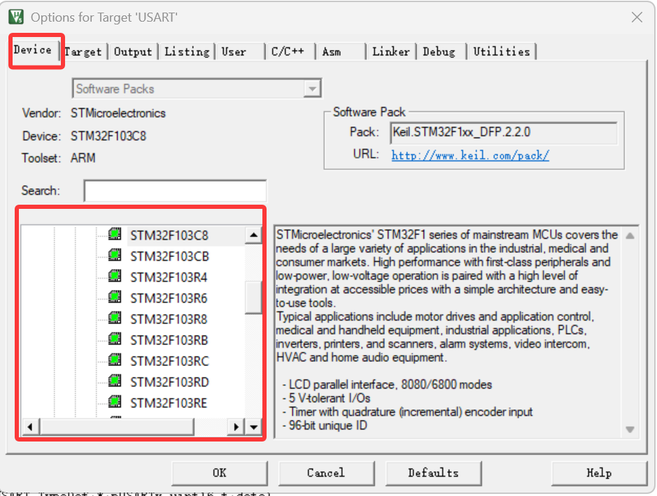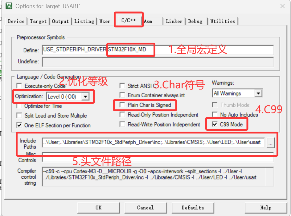 这是最重要的一部分,对于1,这个是全局宏定义,需要根据板子的容量来进行填写,具体需要查看自己板子上ld,md,hd哪种,我之前还见到一种xd的写法,但是我看官方推荐的是上面的三种。对于2,这里可以设置我们编译的优化等级,优化等级不是越高越好,有些会优化原始变量的访问,或者会造成代码歧义,引起难以察觉的错误。对于3,这里是设置keil里面的char类型有无符合。对于4,是否启用C99,对于5,是我们把代码中的头文件路径放入进去。上面5点,1和5需要根据自己设置,其余可以和我一样