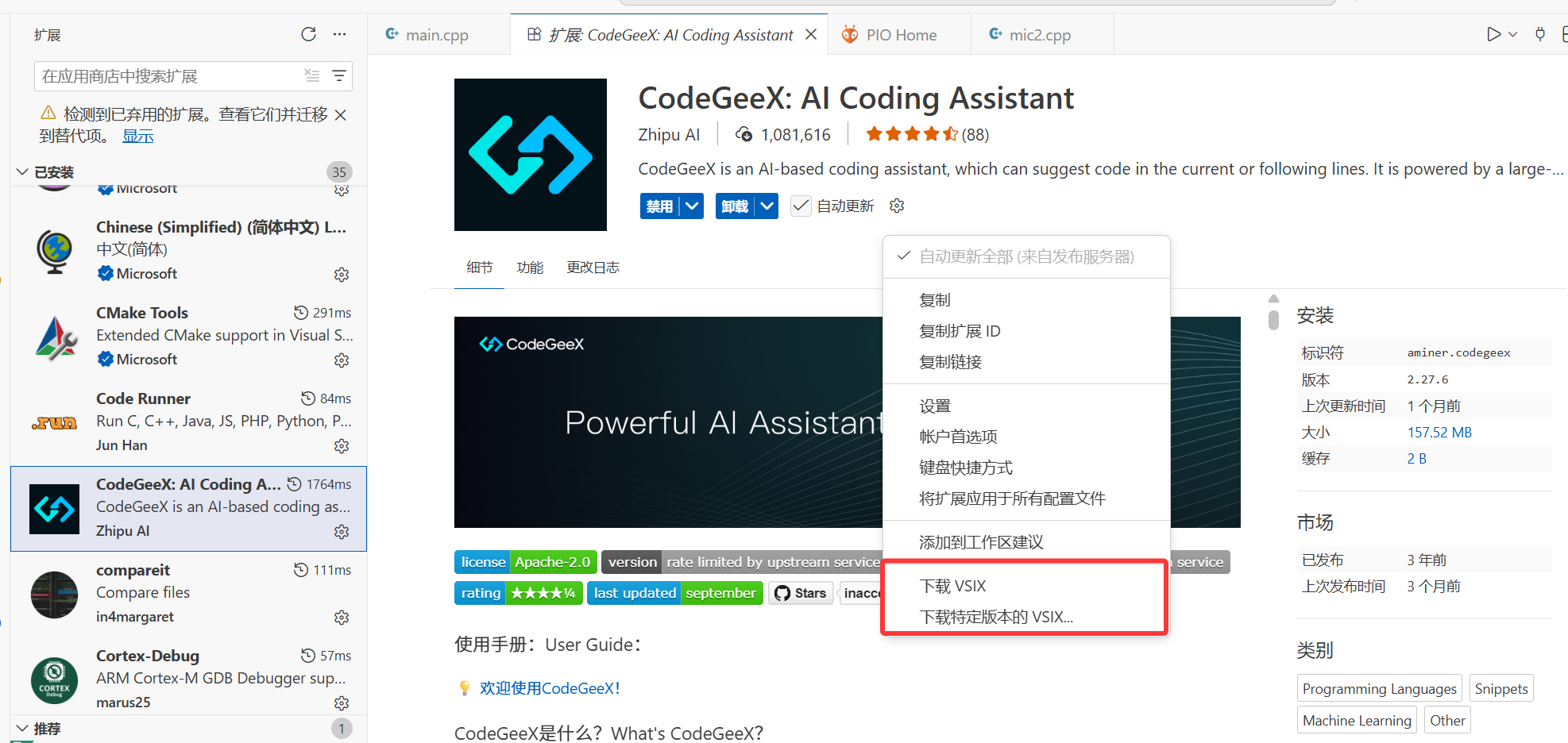 直接在vscode的拓展里面搜索,并下载VSIX,然后拖动到上面的文件夹,但是这个下载VSIX,不一定成功