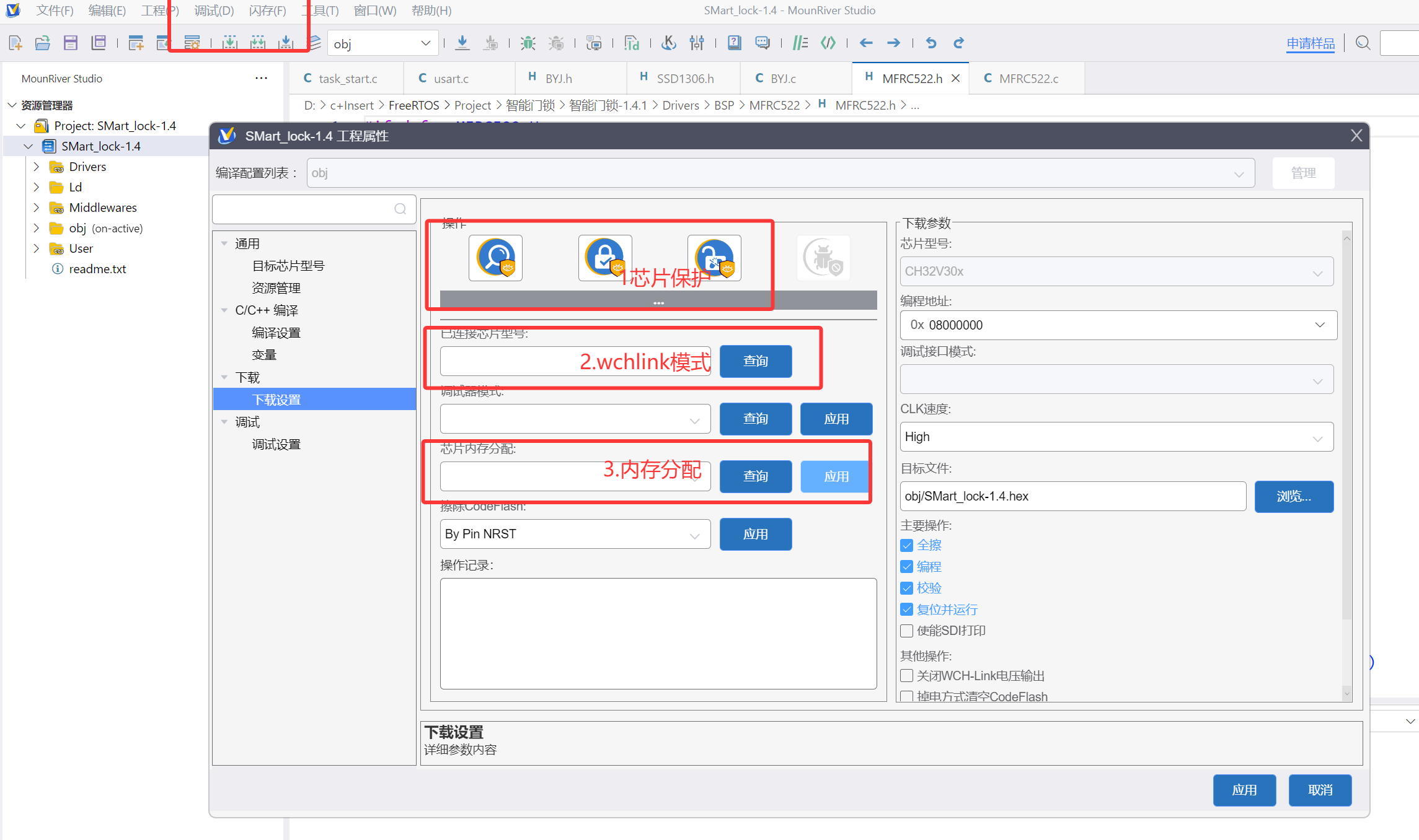 在闪存->下载配置,打开如下界面,1是设置芯片保护,解除保护才能下载代码。2,这是设置wchlink的模式,这个芯片是RV架构,我们需要使用这个。3,是设置我们的RAM和ROM的内存分配,与3.2的LD文件保持一致