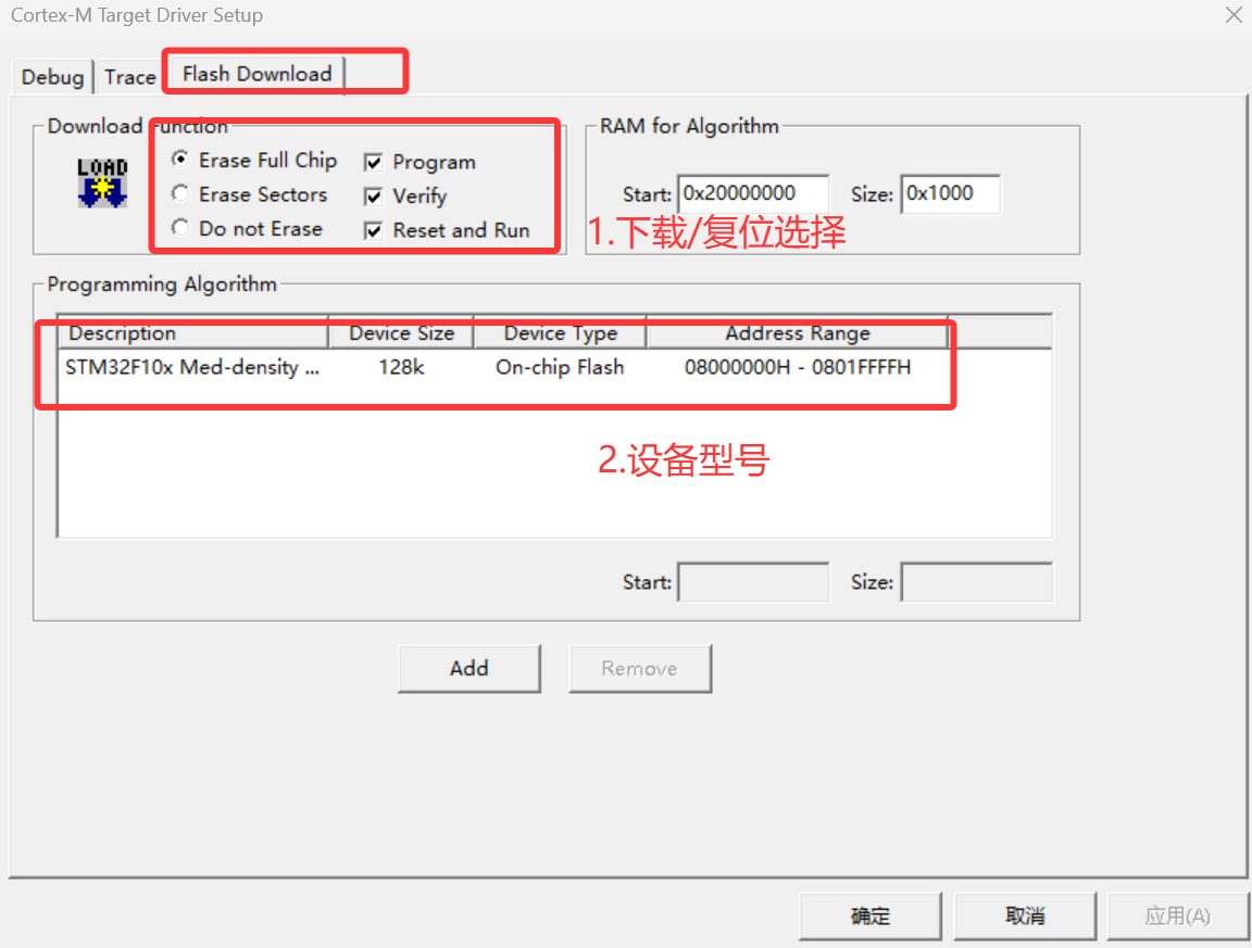 这里对于1来说,我们看名字,就指定知道可以设置芯片的擦除方式,全擦,块擦,不擦,然后是复位后运行,这是相当于下载程序后就会自动执行,不勾选需要下载程序后,手动使用复位键,这里和我一样就行。对于2,这是根据自己板子的型号选择对应的烧录算法,在下面add可以进行添加
