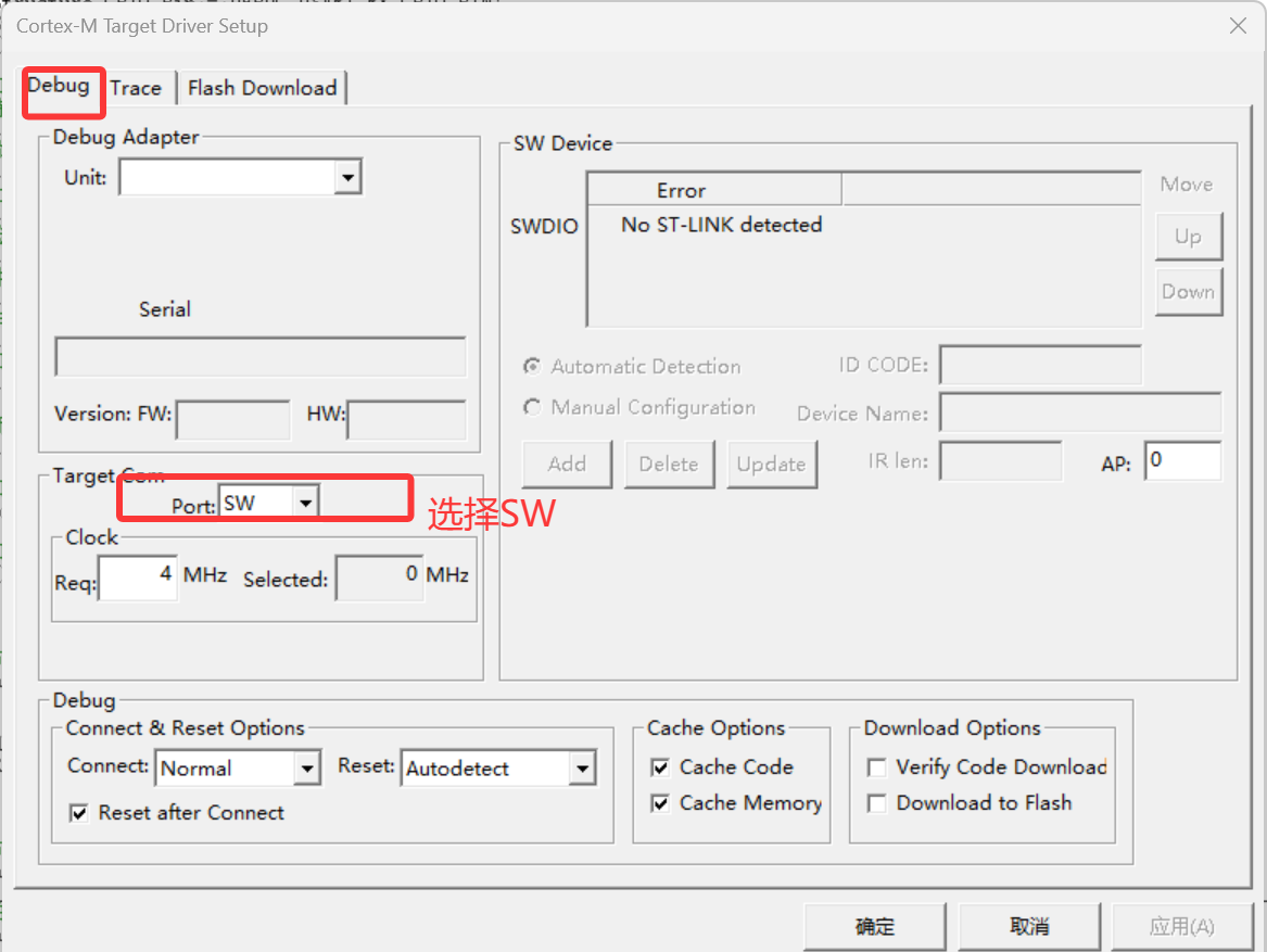 在这里我们设置是SW两线烧录,我们使用的是SW协议的烧录方式,除了VCC和GND之外,只需两线,如果是JTAG,就选择JTAG,使用的是四线