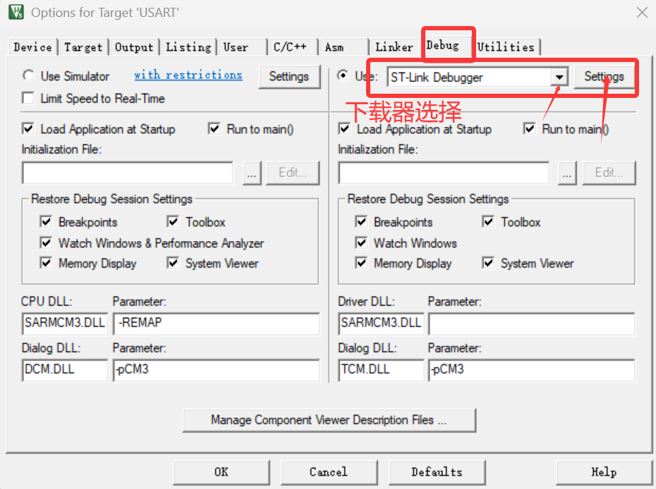 在这里选择我们扫了烧录代码时,使用的工具,根据自己的使用选择