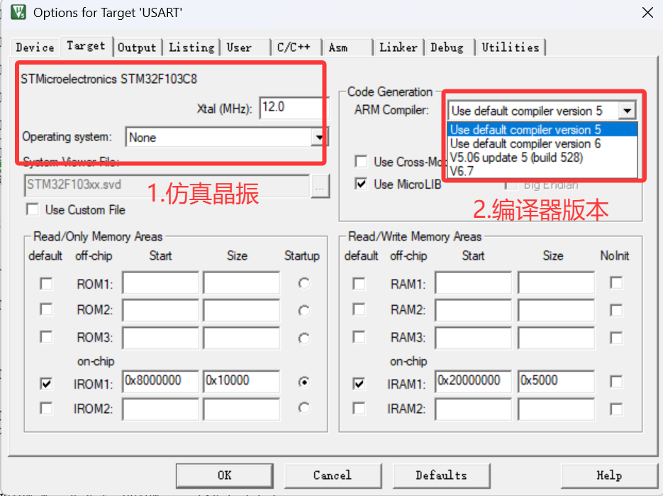 在下面1是我们的仿真晶振,这个选项是在较老版本Keil才可以设置,设置的软件仿真时的晶振,现在可以不管。2是我们编译器的版本,这里有几个可以选,在新版本只有6版本,但是对于一些问题无法解决,切换版本可以有用.