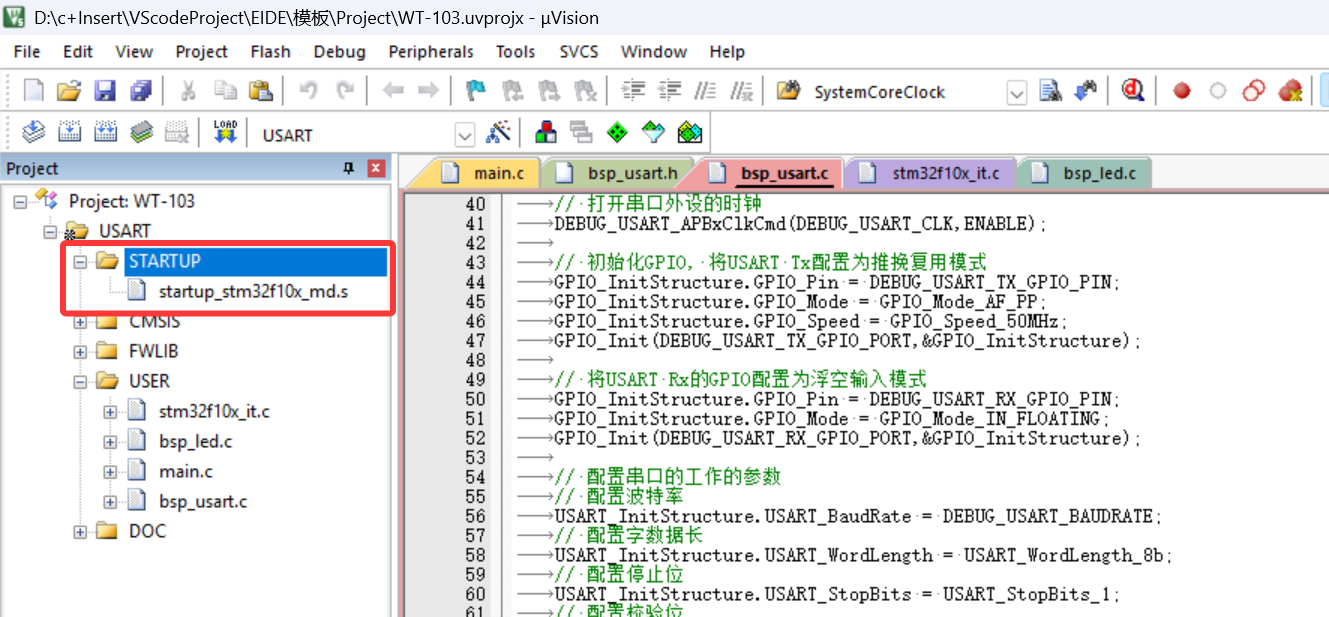 - 更改启动文件,我们需要找到我们现在使用板子的芯片对应的启动文件,参考1.2