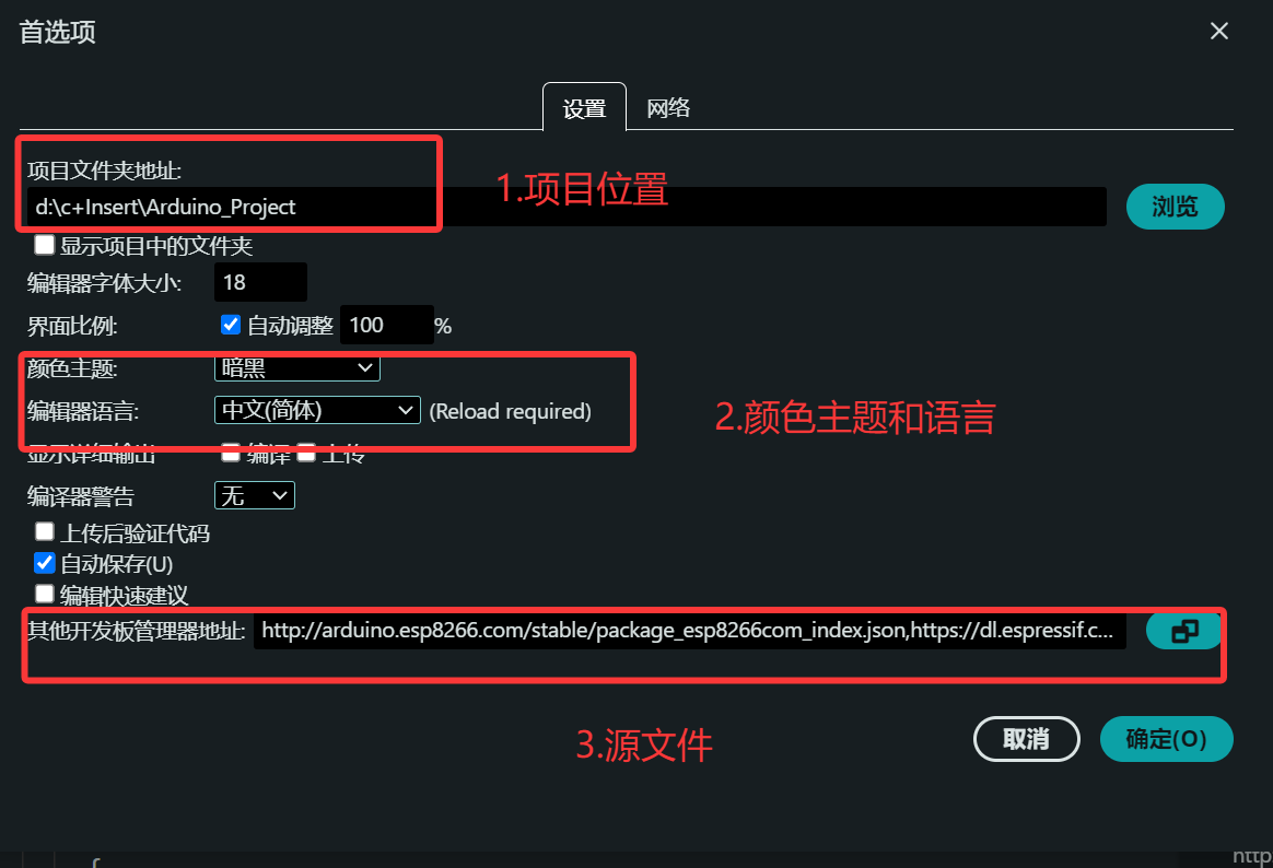 打开 文件->首选项,得到如下,1是我们的项目保存的位置,注意库文件也在这个地方。2,这里设置颜色主题和语言。3,这里设置镜像源文件,用来下载就是因为这个,下载慢,很多人说什么科学上网,设置静态代理IP,其实根本没必要,现在乐鑫官方有对中国用户理想的镜像源