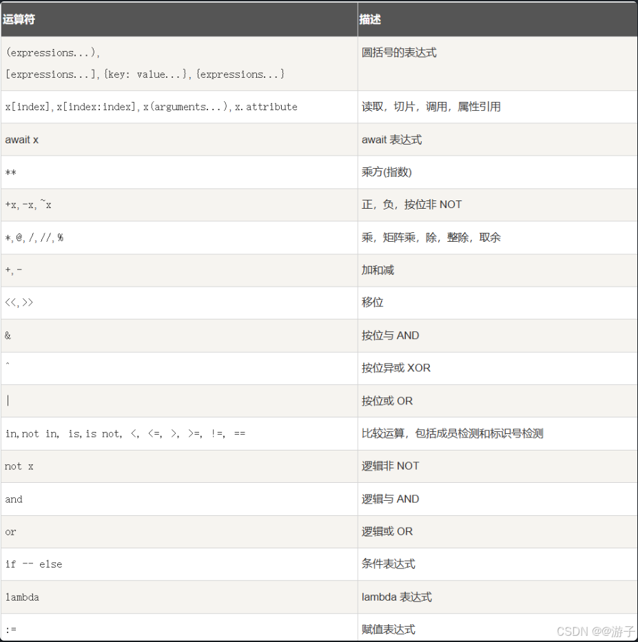 以下表格列出了从最高到最低优先级的所有运算符, 相同单元格内的运算符具有相同优先级。 运算符均指二元运算,除非特别指出。 相同单元格内的运算符从左至右分组(除了幂运算是从右至左分组):