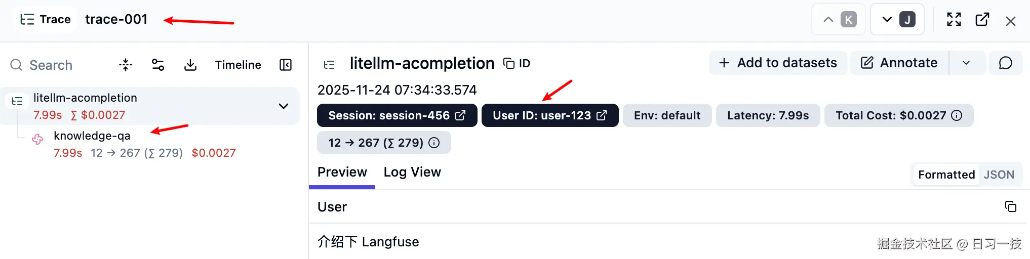 进入 Langfuse 的 Trace 页面,应该能看到详细的追踪数据: