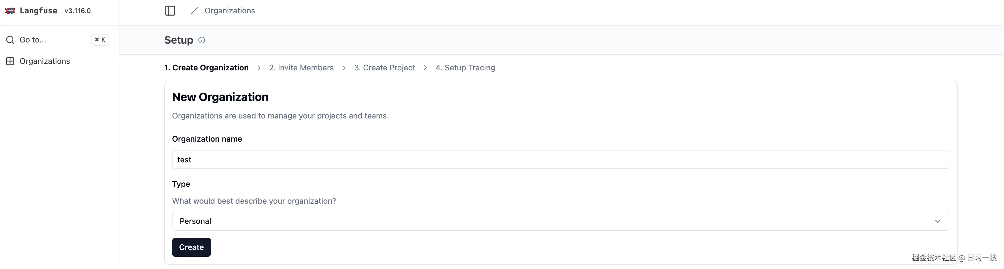 我们首先访问 Langfuse 官网,注册账号并登录,然后创建一个组织: