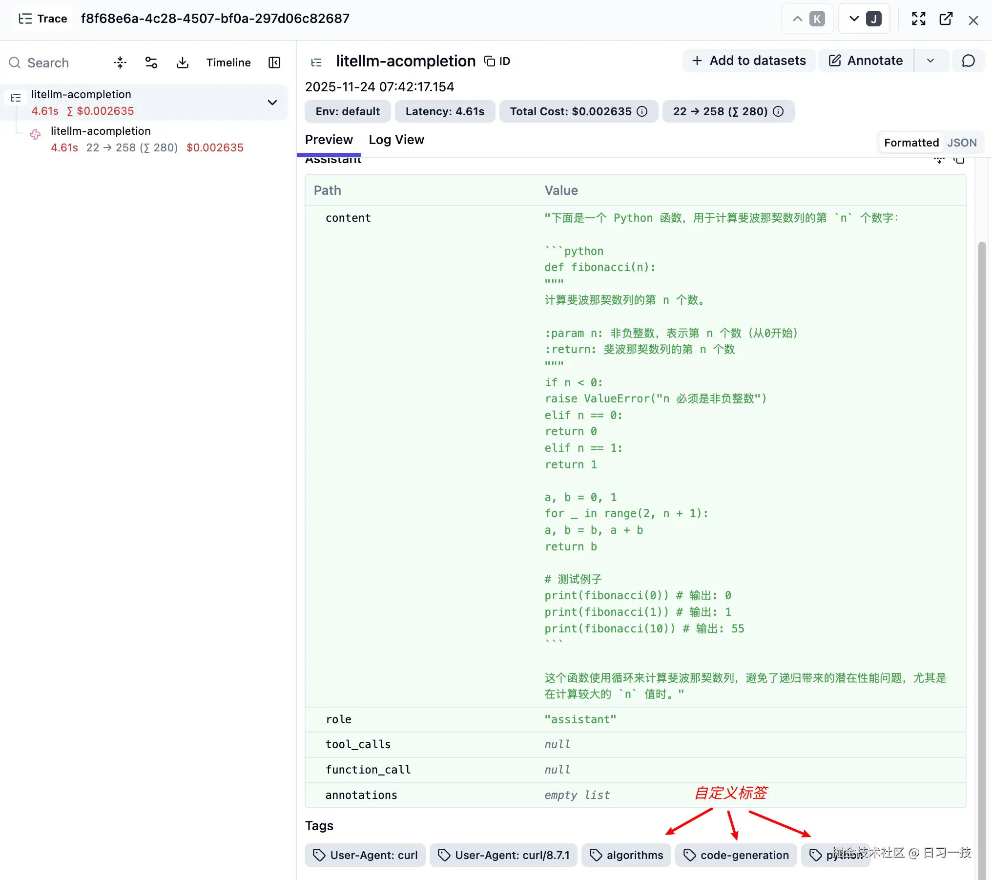 通过统一的回调机制和标准化的日志格式,我们可以将 LiteLLM 的日志数据与现有的可观测性生态系统无缝整合,实现全面的性能监控、成本优化和问题诊断。