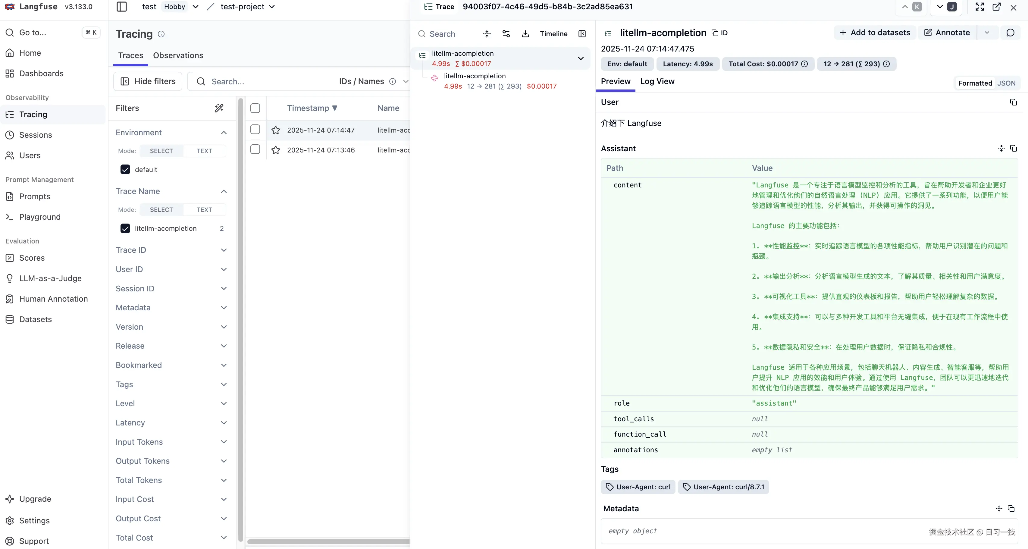 Langfuse 是专为 LLM 应用设计的开源可观测性平台,提供了完整的链路追踪、性能分析、成本监控和质量评估能力。