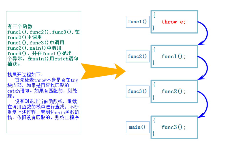 • 如果当前函数中没有try/catch子句,或者有try/catch子句但是类型不匹配,则退出当前函数,继续在外层调用函数链中查找,上述查找的catch过程被称为栈展开。