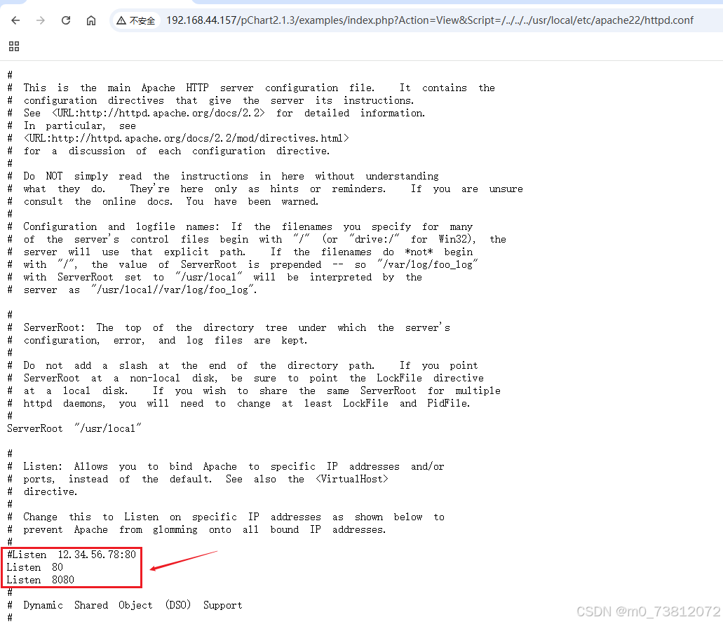既然如此,那我们可以访问目标主机系统中Apache中间件的主配置文件httpd.conf,以确认我们无法访问8080端口的原因。