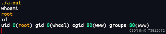 (5)通过./a.out命令执行编译产生的可执行文件,将直接获得root权限