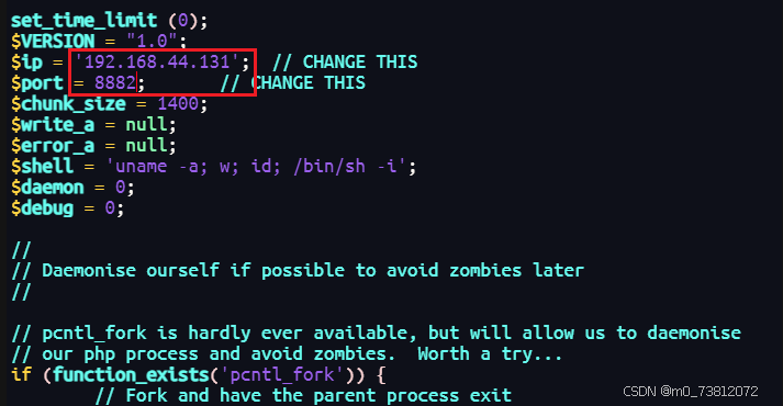 (1)使用该文件时,首先要将其内部的反弹IP和端口更改为目前Kali系统实际使用的IP地址以及准备监听反弹shell的端口;