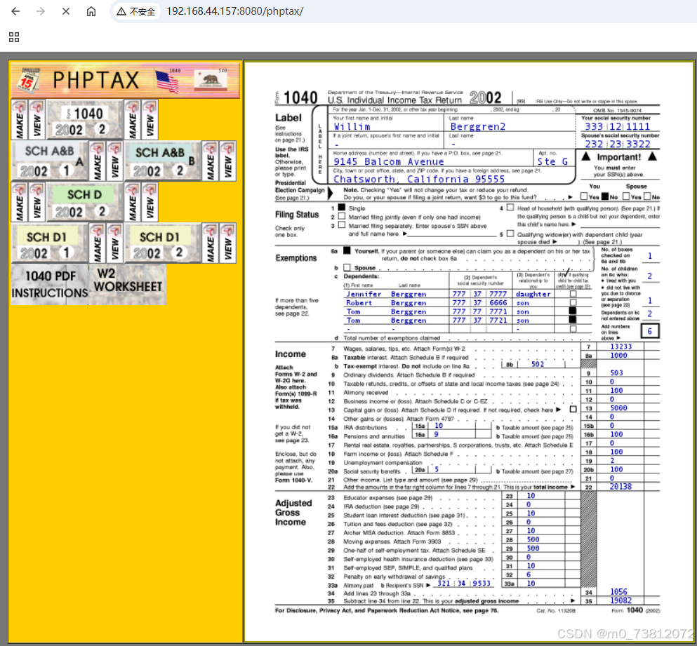 include、eval),使其存在多种经典漏洞,包括目录穿越、文件包含(LFI/RFI)、任意文件读取与写入,以及可进一步导致远程代码执行(RCE)。因此 PHPTax 常被安全人员作为教学和靶场练习的示例目标。