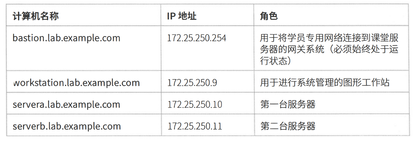 所有学员计算机系统都有一个标准用户帐户student , 其密码为student 。 所有学员系统的root 密码都是 redhat 。
