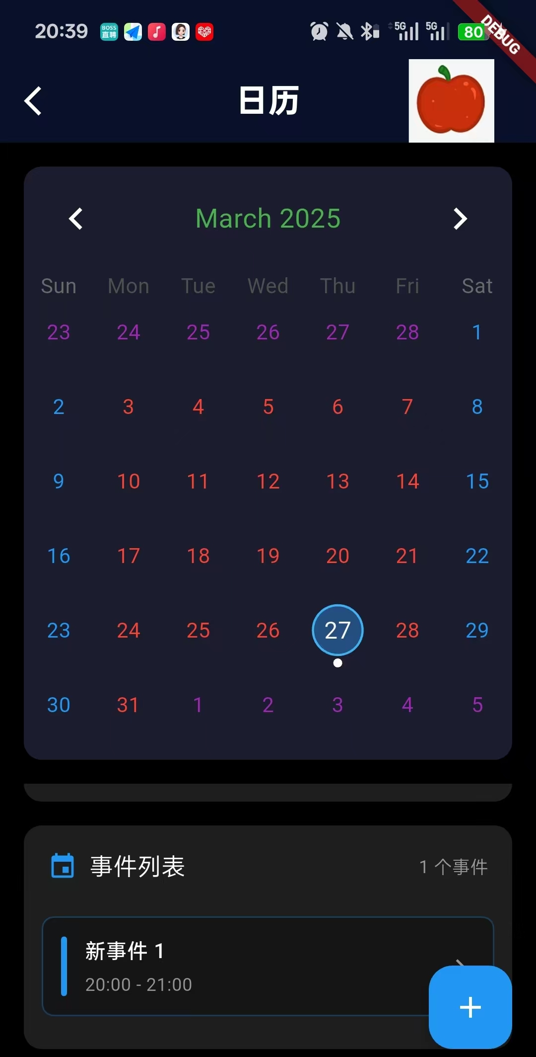 详细描述:这是一个日历,当用户选中某一天,然后点击右下角的蓝色加号,就能给这一天增加新事件。
