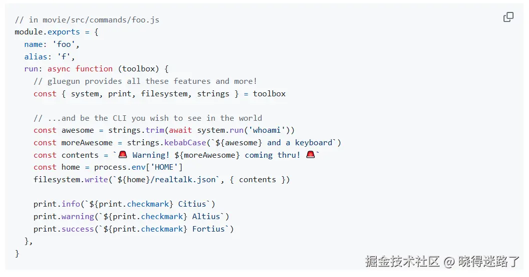 - Gluegun:用于开发 Node 命令行界面应用,其内置诸多功能,包括模板生成、子命令支持、彩色输出、参数解析等。