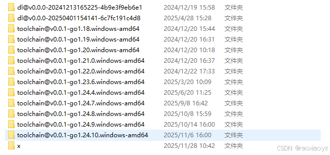 toolchain 下载的多个版本的go存放在path\pkg\mod\golang.org下面,里面有bin和src,