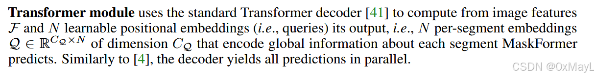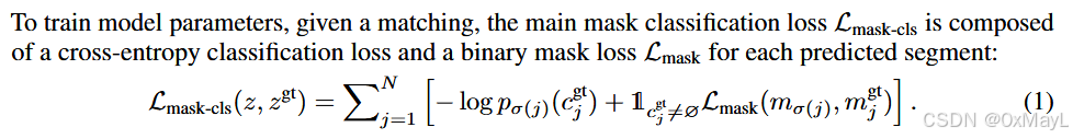 - 然后和DETR一致,这N个段嵌入首先通过一个简单的MLP得到维度为N×(K+1)N\times (K+1)N×(K+1)的类别概率分布,也是引入了一个No object类别,K是目标数。