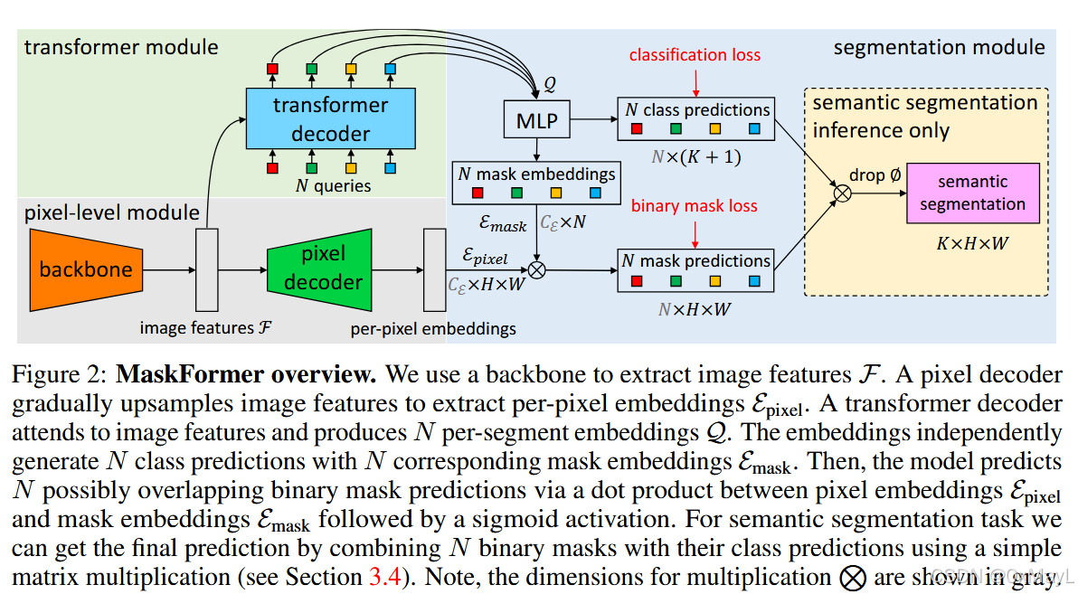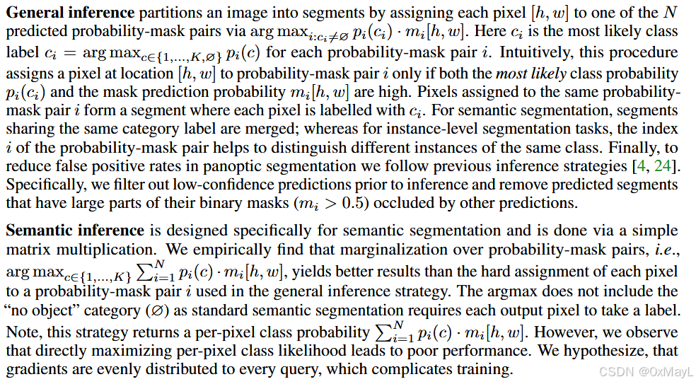 - 对于一般的语义分割任务:每一个查询向量的类别概率分布p_i×\times×生成的软掩码m_i,最后求和即可,得到H*W的类别概率分布,最后取最大值即可。