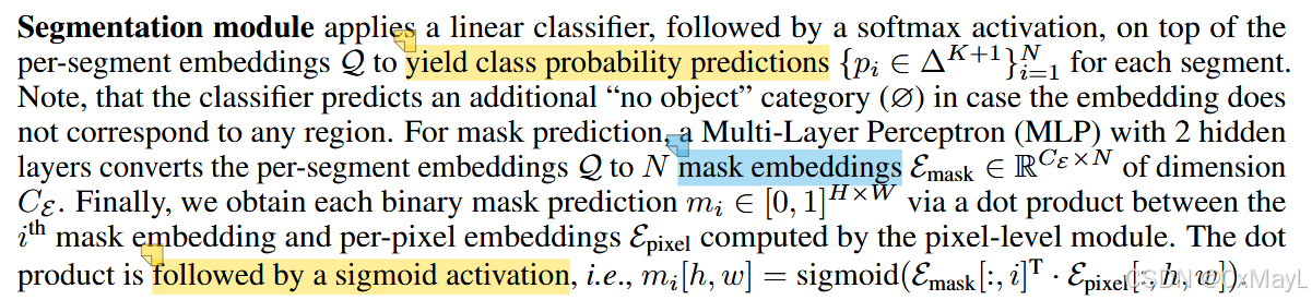 - 不同的是,需要生成掩码,不能直接通过段嵌入+线性层得到。于是段嵌入会被映射为掩码嵌入 ,掩码嵌入与特征图进行QK矩阵乘法操作,得到N×H×WN\times H\times WN×H×W个语义掩码。