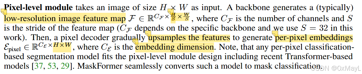 - 和DETR一样,使用骨干网络获取一个低分辨率特征图。再使用一个FPN获得分辨率与输入图像相同的特征图(缘于语义分割任务的特点)。