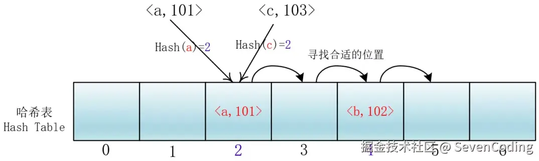 它的实现是在插入一个元素的时候,先通过哈希函数进行判断,若是发生哈希冲突,就以当前地址为基准,根据再寻址的方法(探查序列),去寻找下一个地址,若发生冲突再去寻找,直至找到一个为空的地址为止。