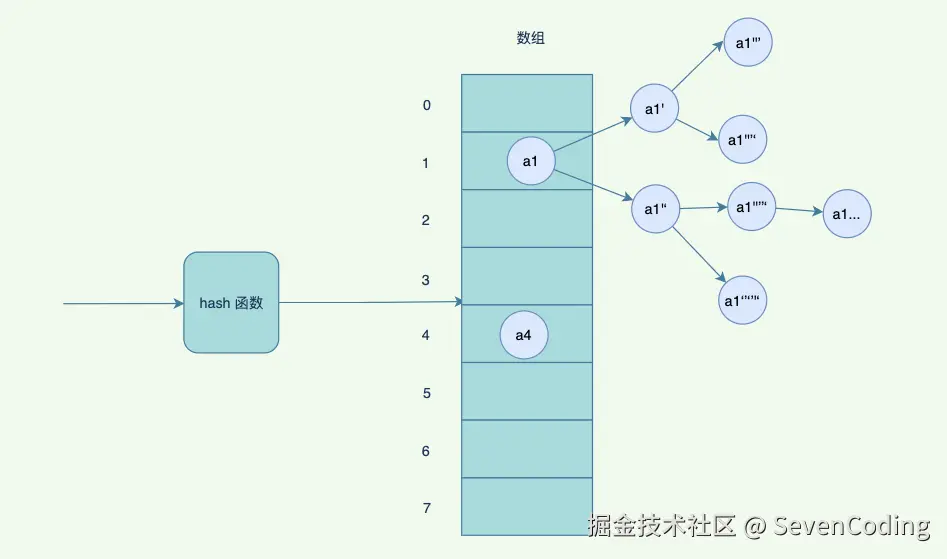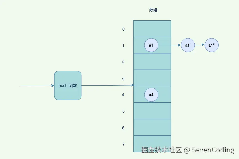 但是你肯定会想到,如果数组太⼩了,放了⽐较多数据了,怎么办?再放冲突的概率会越来越⾼,其实这个时候会触发⼀个扩容机制,将数组扩容成为 2 倍⼤⼩,重新hash 以前的数据,哈希到不同的数组中。