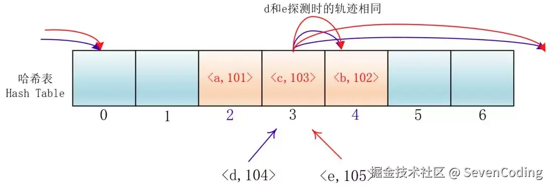 但是这样会有一个问题,就是随着键值对的增多,会在哈希表里形成连续的键值对。当插入元素时,任意一个落入这个区间的元素都要一直探测到区间末尾,并且最终将自己加入到这个区间内。这样就会导致落在区间内的关键字Key要进行多次探测才能找到合适的位置,并且还会继续增大这个连续区间,使探测时间变得更长,这样的现象被称为"一次聚集(primary clustering)"。