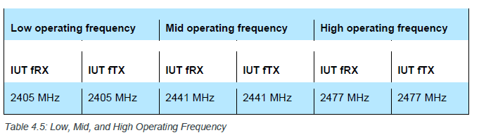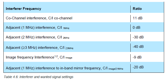- 带有 PRBS15 的蓝牙调制干扰信号(见第 56 节"参考信号定义")。此干扰信号在 fI = fRX 下运行。关于干扰功率水平,请参见表 4.6。