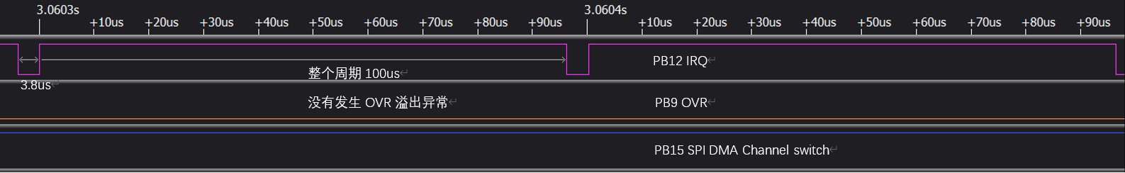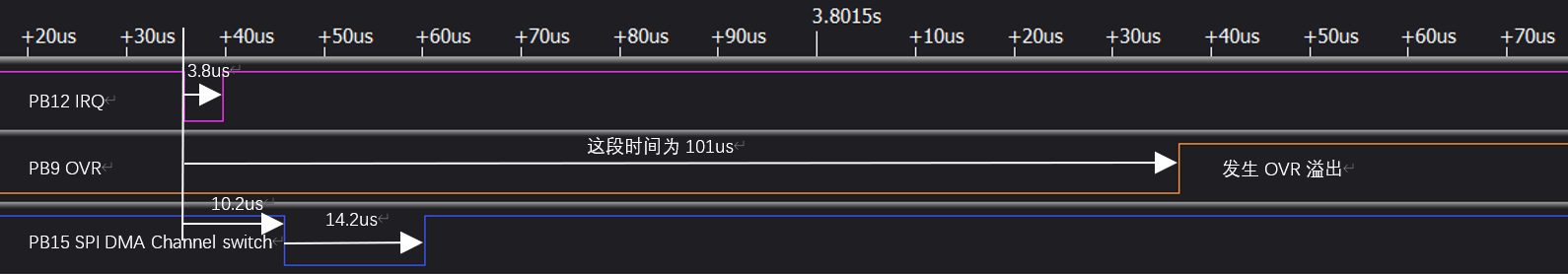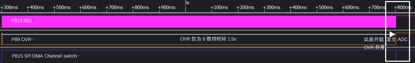 在上电后的1.5s,将会发生SPI发送的DMA通道从DMA1 Channel2变更到DMA1 Channel7,再从DMA1 Channel7变更到DMA1 Channel2。同时在这个时间点,也发生了ADC OVR溢出异常。