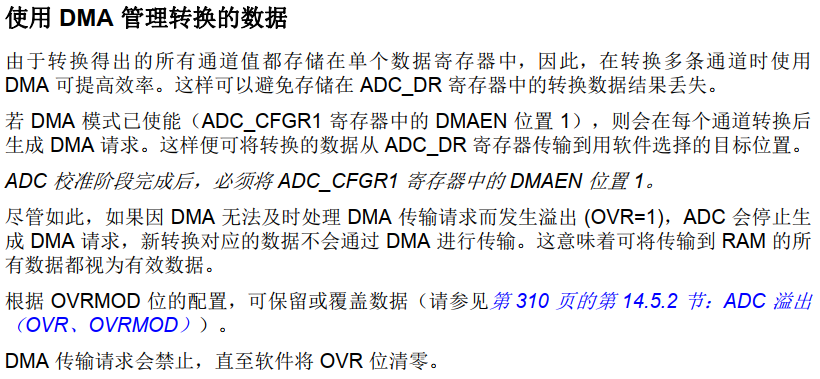 如果因 DMA 无法及时处理 DMA 传输请求而发生溢出 (OVR=1), ADC 会停止生成 DMA 请求,新转换对应的数据不会通过 DMA 进行传输。这意味着可将传输到 RAM 的所有数据都视为有效数据。