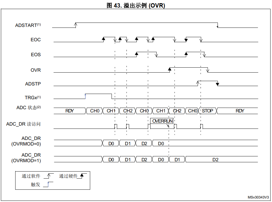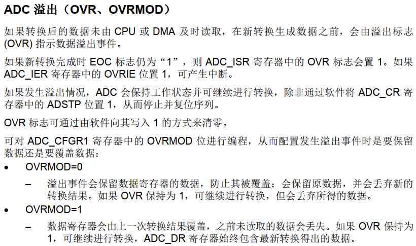 如果转换后的数据未由 CPU 或 DMA 及时读取,在新转换生成数据之前,会由溢出标志 (OVR) 指示数据溢出事件。