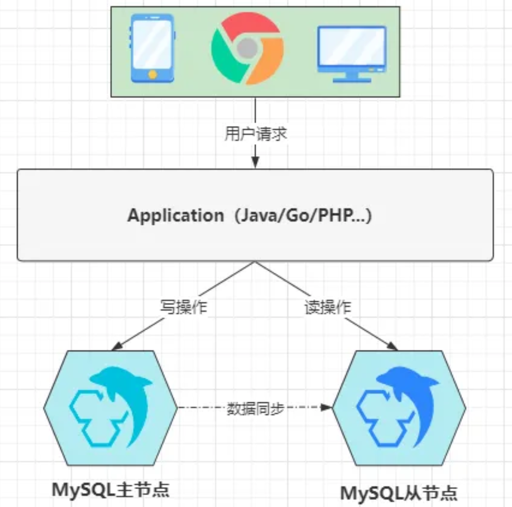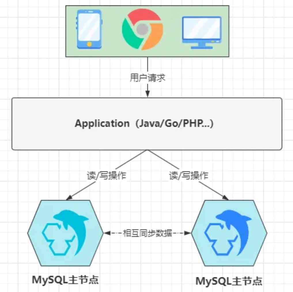 - 若公司项目中读写请求的比例对半开,同时整体的并发量也不算低,至少超出了单库的承载阈值,这时就可以选用双主/多主架构,结构如下: