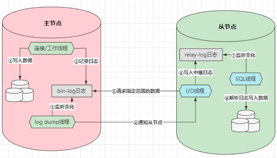 MySQL是基于它自身的Bin-log日志来完成数据的异步复制,因为Bin-log日志中会记录所有对数据库产生变更的语句,包括DML数据变更和DDL结构变更语句,数据的同步过程如下: